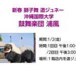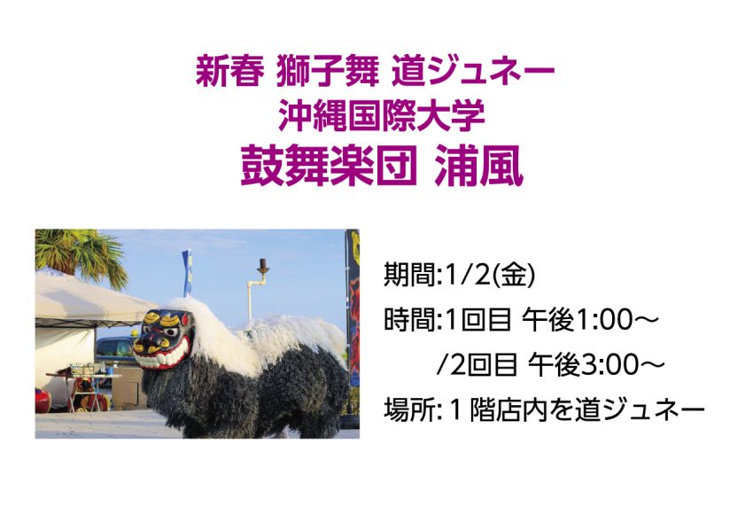 ★新春 獅子舞 道ジュネー 沖縄国際大学 鼓舞楽団 浦風・【1回目】開演:13時~・【2回目】開演:15時~・会場=イオン名護店1階ベスト電器前イベント広場