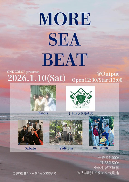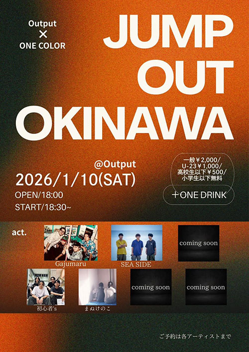 ★Output PRESENTS THE新年会LIVE・開場:19時30分/開演:20時・出演=NARU_KA_MI、cat bears、また今夜ズ、MALDO、その他調整中・会場=ライブハウスoutput