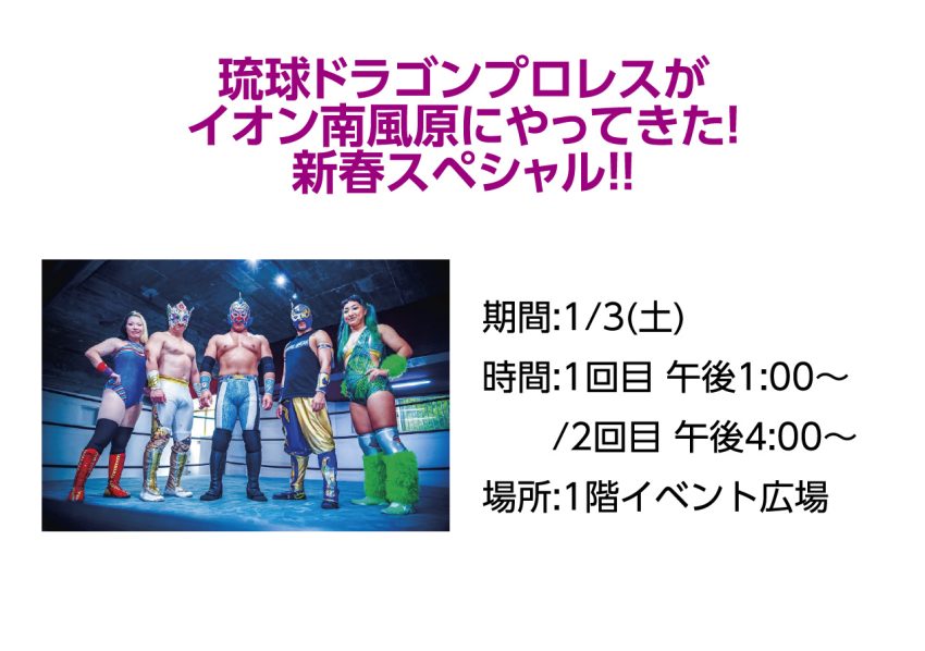 ★琉球ドラゴンプロレスがイオン南風原にやってきた!新春スペシャル!!・【1回目】開演:13時~・【2回目】開演:15時~・会場=イオン南風原店1階 イベント広場店
