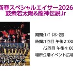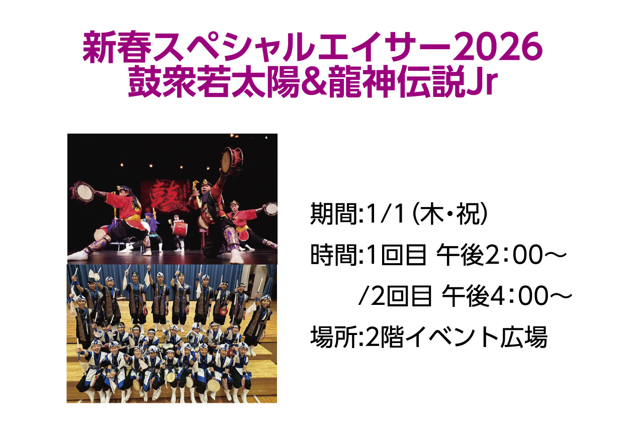 ★新春スペシャルエイサー2026 鼓衆若太陽&琉神伝説Jr・【1回目】開演:14時~:【2回目】開演:16時~・会場=イオン北谷店・2階 イベント広場