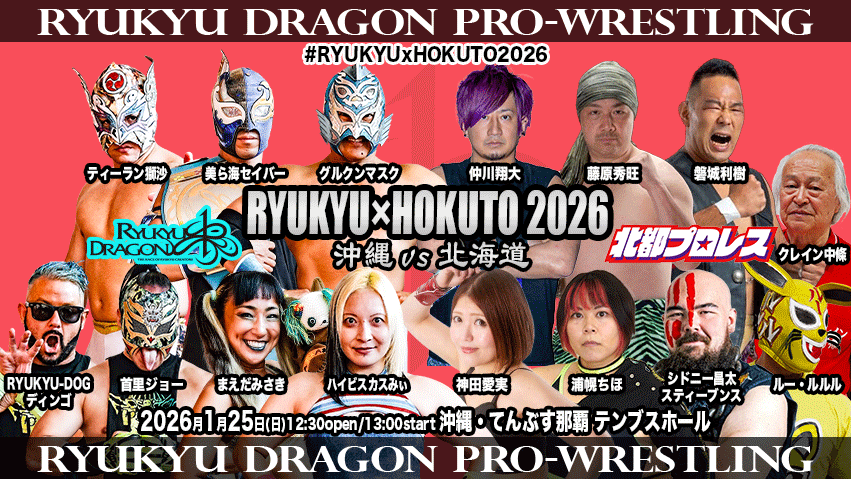 ★琉球ドラゴンプロレスと北都プロレス、全面対抗戦!・開場:12時30分/開演:13時・参戦予定選手=神田愛実、仲川翔大、藤原秀旺、磐城利樹、ルー・ルルル、シドニー翔太スティーブンス、浦幌ちほ、クレイン中條(レフェリー)・会場ーてんぶす那覇・テンブスホール