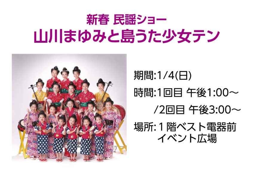★新春 民謡ショー 山川まゆみと島うた少女テン・【1回目】開演:13時~・【2回目】開演:15時~・会場=イオン名護店1階ベスト電器前イベント広場
