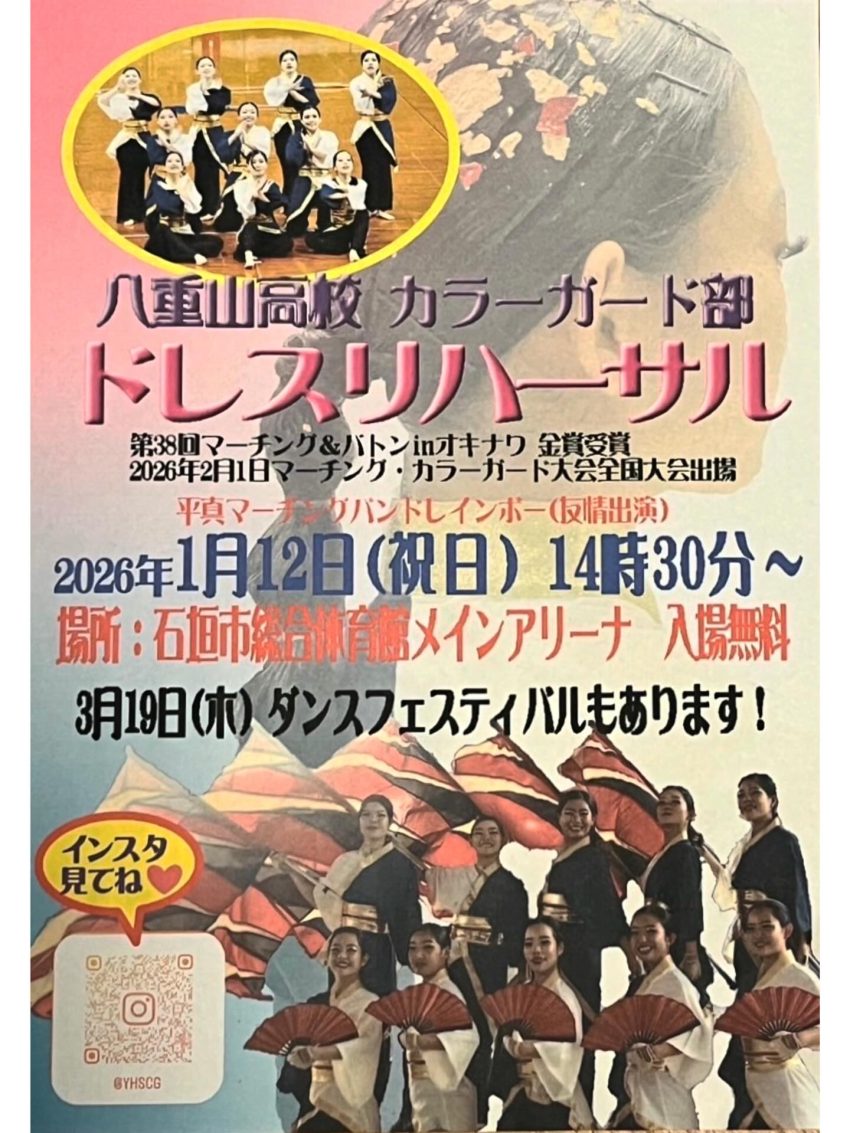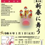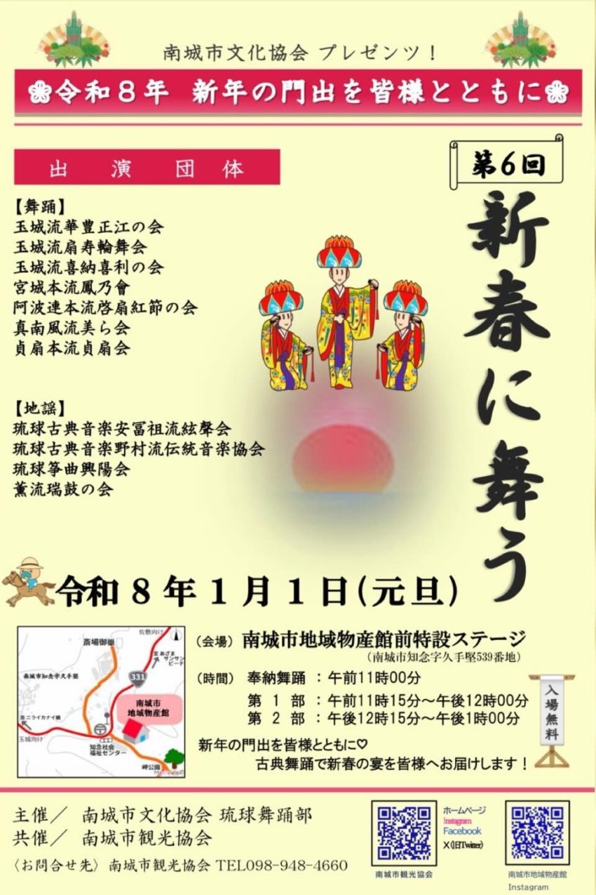 ★令和8年新年の門出を皆様とともに・第6回 新春に舞う・奉納舞踊:午前11時・【第1部】開演:11時15分~終演:12時・【第2部】開演:12時15分~終演:13時・出演団体(舞踊):玉城流華豊正江の会、玉城流扇寿輪舞会、玉城流喜納喜利の会、宮城本流鳳乃會、阿波連本流啓扇紅節の会、真南風流美ら会、貞扇本流貞扇会・地謡:琉球古典音楽安冨祖流絃聲会、琉球古典音楽野村流伝統音楽協会、琉球筝曲興陽会、薰流瑞鼓の会・会場=南城市地域物産館前特設ステージ(南城市知念久手堅539)