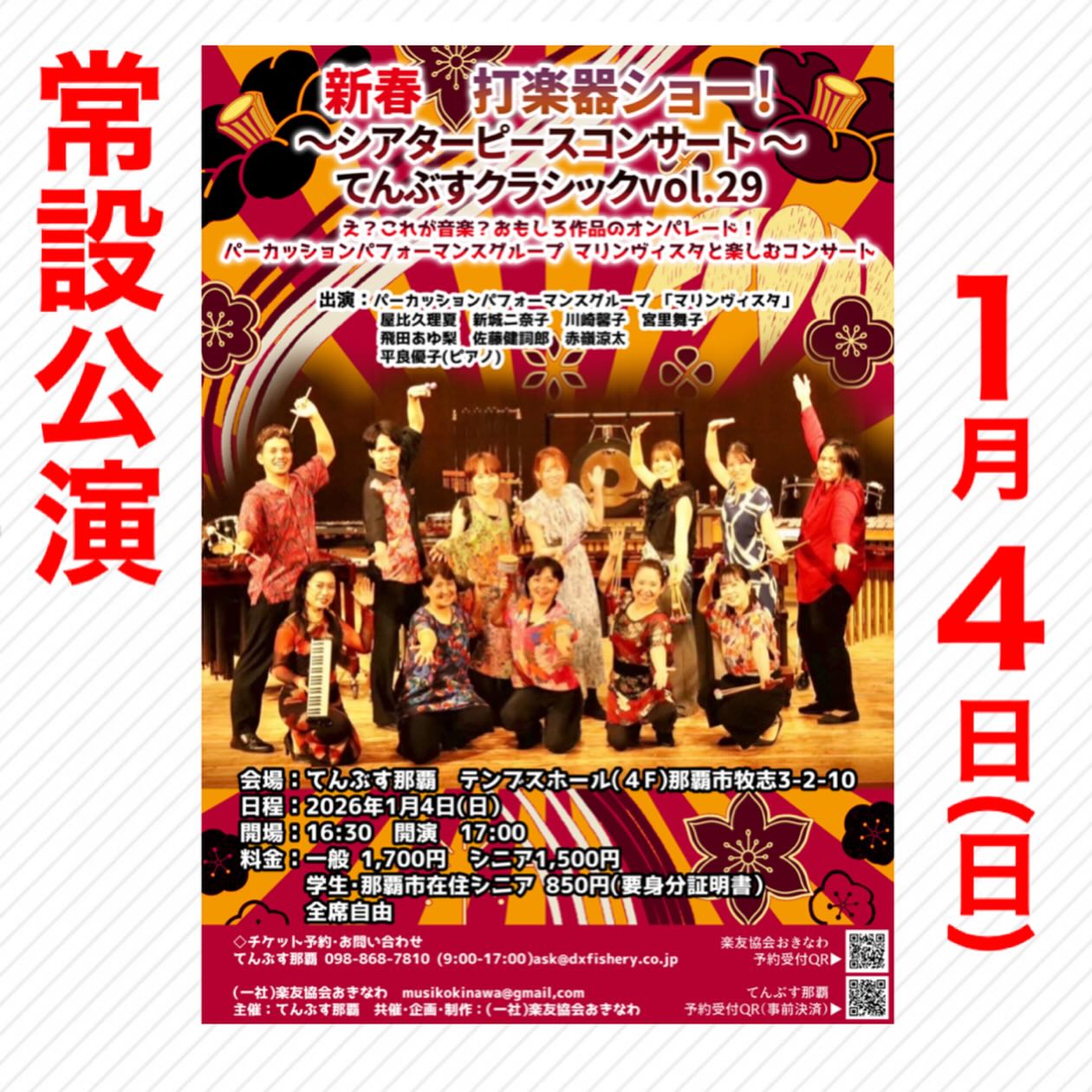 ★新春“打楽器ショー! シアターピースコンサート~ てんぶすクラシックvol.29・開場:16時30分/開演:17時・出演:パーカッションパフォーマンスグループ「マリンヴイスタ」=屋比久理夏、 新城二奈子、 川崎馨子、 宮里舞子、飛田おゆ梨、佐藤健詞郎、赤嶺涼太、平良優子(ピアリ)…・会場=てんぶす那覇・テンブスホール