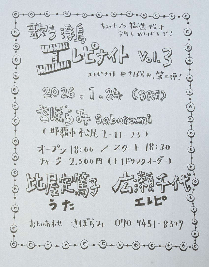 ★歌う浮島 エレピナイト・開場:18時/開演:18時30分・出演=うた:比屋定篤子・エレピ:広瀬千代・会場=さぼらみ Saborami(那點市松公尾2-11-23)