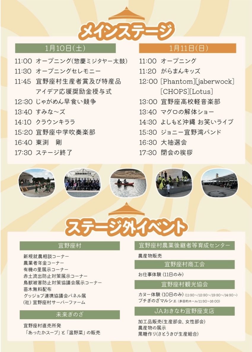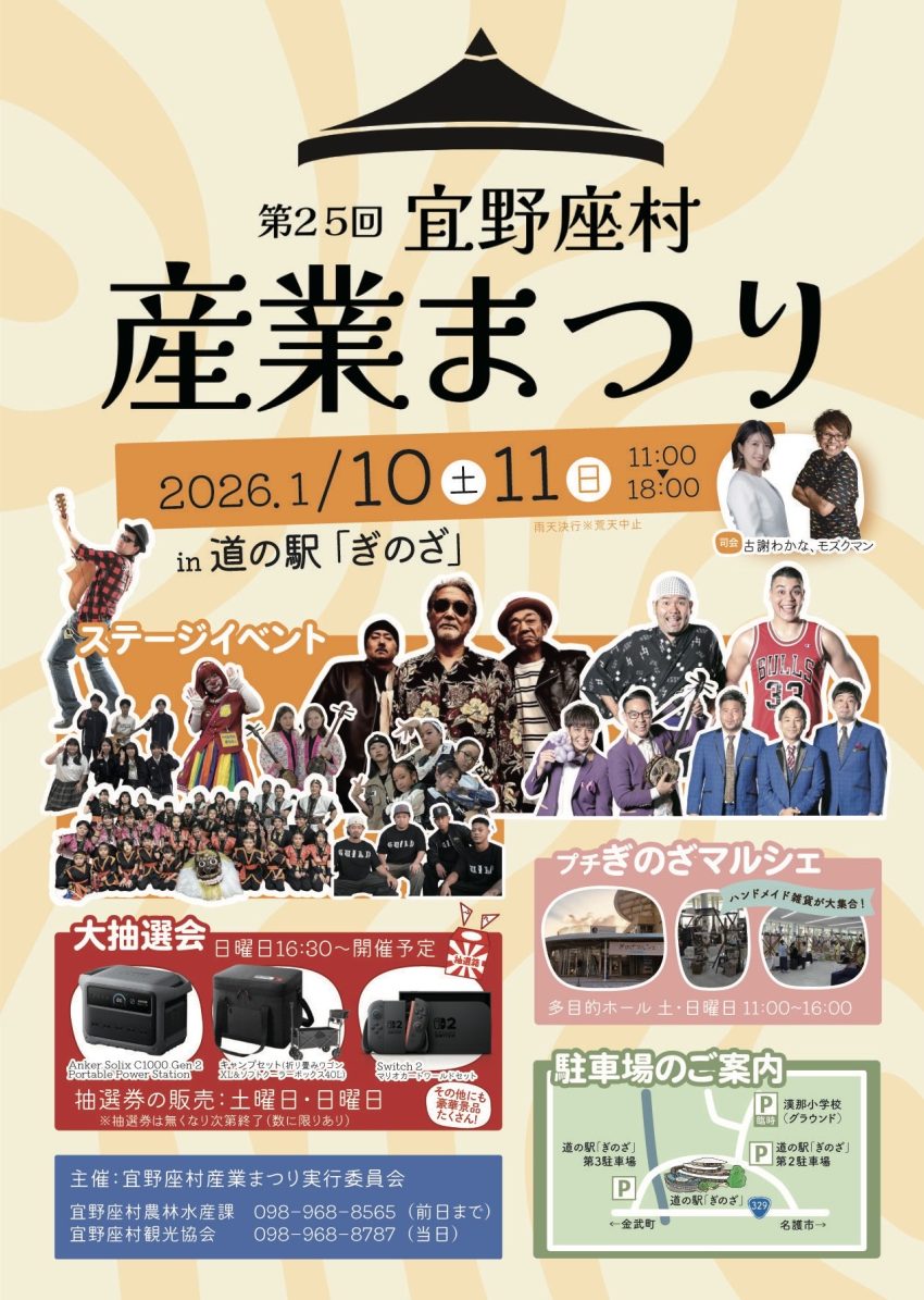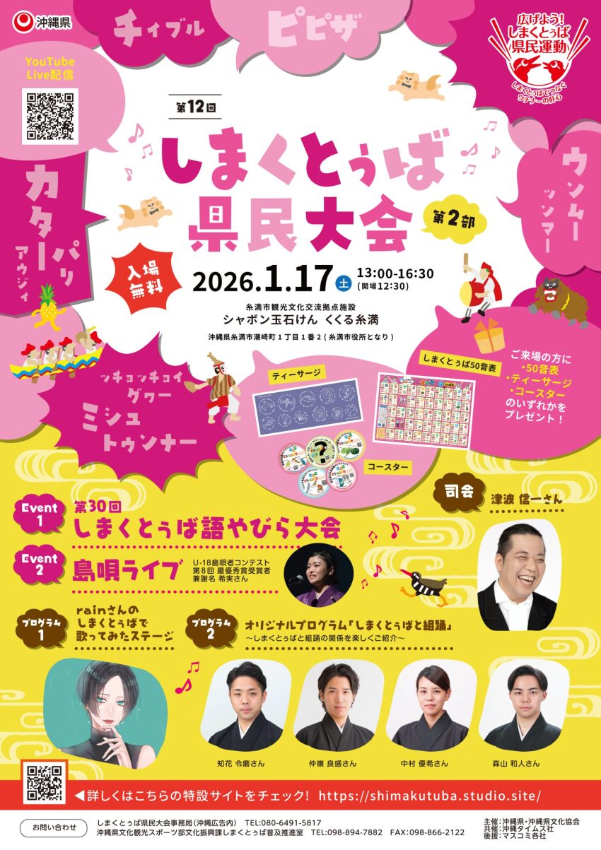 ★初笑いパレード 2026 Powered by てんたか・11時~12時:初恋クロマニヨン、ありんくりん、キンピラゴボウ、ただのあきのり、こきざみインディアン、糖と汗・14時30分~15時30分:ありんくりん、TOKU、護得久栄昇・仲座健太、ニライカナイ、こきざみインディアン、ノーブレーキ・17時~18時:ありんくりん、マルキヨビル、ニライカナイ、ゴリラコーポレーション、すっとこどっこい、ノーブレーキ・会場=パルコシティ1階マーケットプラザ