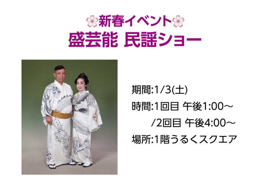 ★新春イベント 盛芸能 民謡ショー・【1回目】開演:13時~・【2回目】開演:16時~・会場=イオン那覇店1階うるくスクエア