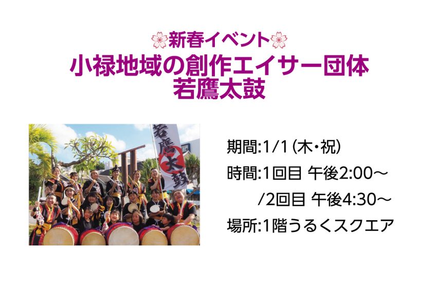 ★新春イベント 小禄地域の創作エイサー団体 若鷹太鼓・【1回目】開演:14時~・【2回目】開演:16時~・会場=イオン那覇店1階うるくスクエア