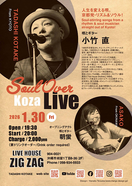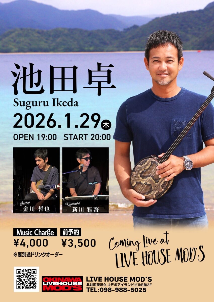 ★池田卓・開場:19時/開演:20時・出演=池田卓(唄、三線)、新川 雅啓(Key)、金川哲也(Ag)・会場=LIVE HOUSE MOD’S