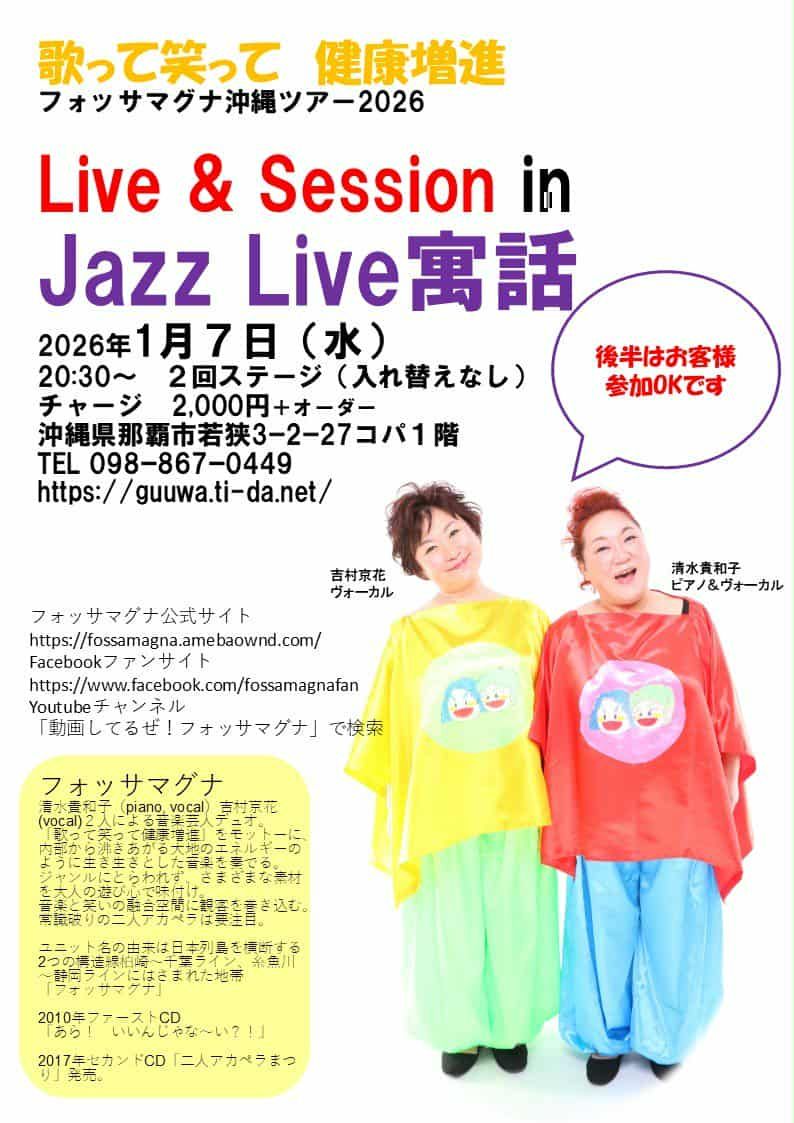 ★歌って笑って 健康増進 フォッサマグナ沖縄ツアー2026・開演:20時30分~(2回ステージ)・出演=吉村京花:ヴォーカル、清水貴和子:ピアノ&ヴォーカル・会場=Jazz Live in 寓話