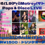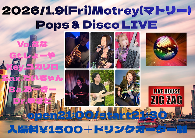 ★Motrey(マトリー) Pops & Disco LIVE・開場:21時/開演:21時30分・出演=Vo.なな、Gt.しょうや、Key.ユカリロ、Sax.だいちゃん、Ba.あーきー、Dr.ゆきと・会場=ライブハウスZIGZAG