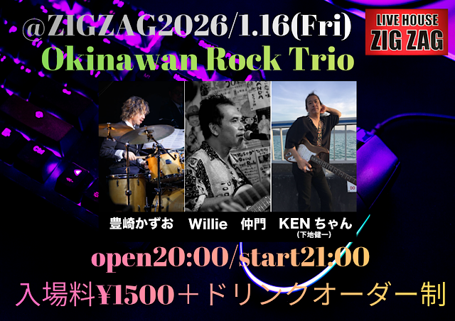 ★音楽色堂 新春LIVE・開場:19時/開演:20時・出演=新川雅啓:Vo.key.、国吉亮:Vo.Guitar、上間勝吉:Vo.Bass、イハタケ:Vo.Drums・会場=LIVE HOUSE MOD’S