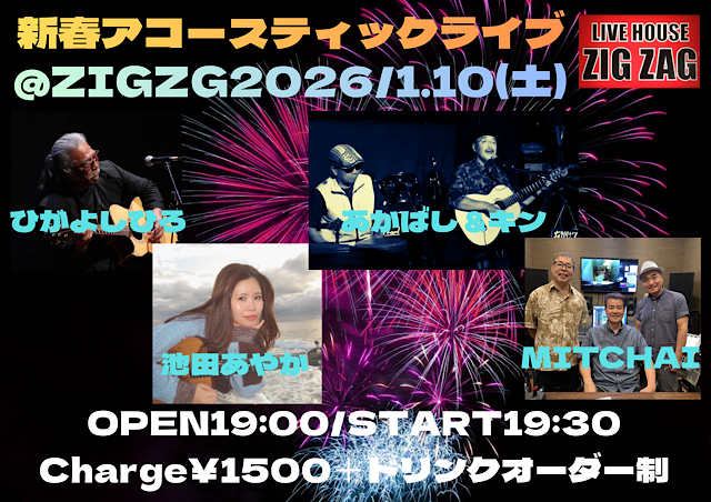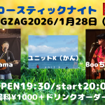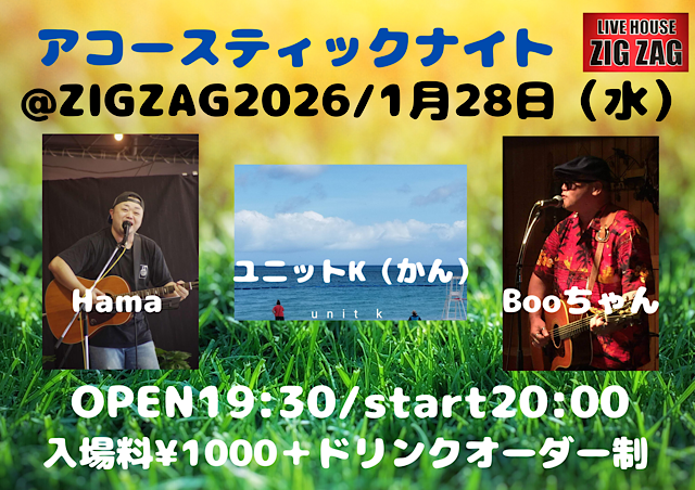 ★アコースティックナイト・開場:19時30分/開演:20時・出演=ユニットK(かん)、Hama、Booちゃん・会場=ライブハウスZIGZAG