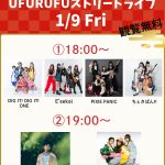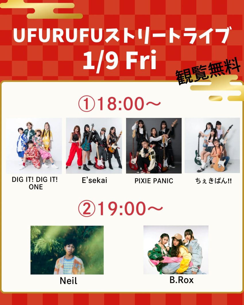 ★UFURUFUストリートライブ情報・①開演:18時~・②開演:19時~・出演=①:DIG IT! DIG IT! ONE/ E’sekai / PIXIE PANIC(初)/ ちぇきばん‼︎(初)・②Neil / B.Rox・会場=パレットくもじ UFURUFU