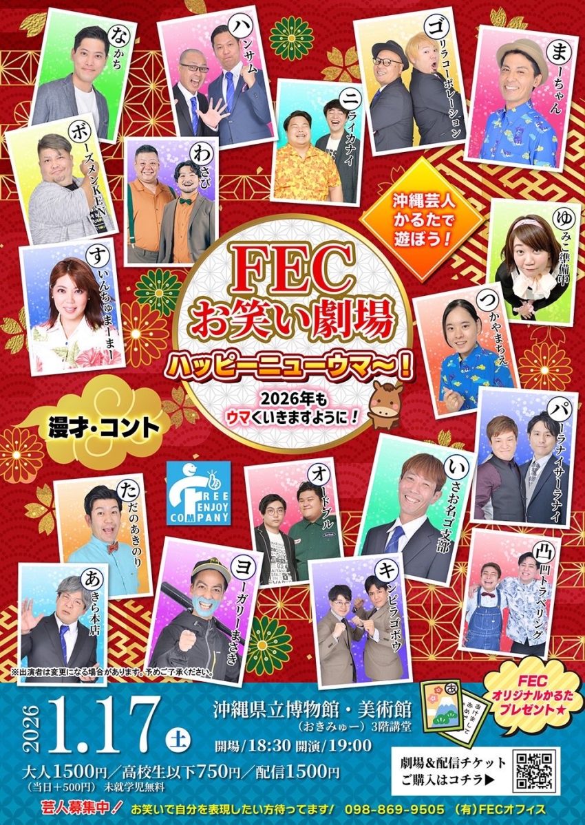 ★宮古島初上陸!新春初笑い!FECお笑い劇場下地イサムさんと一緒!・開場:18時/開演:19時・出演=下地イサム / 護得久栄昇with仲座先輩 / 大兼のぞみ / パーラナイサーラナイ / やぎのシルー / ヨーガリーまさき / なかち / ただのあきのり・会場=宮古島市文化ホール(マティダ市民劇場)