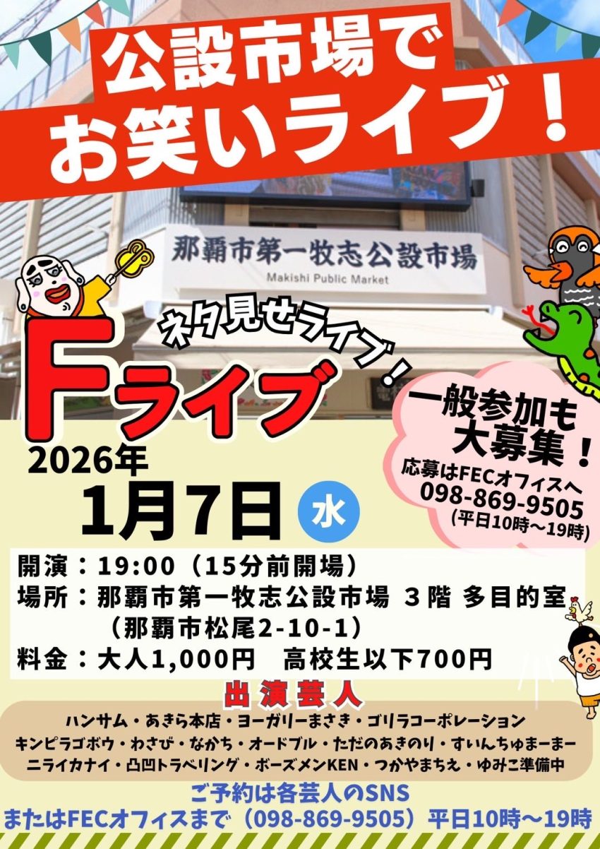 ★公設市場でお笑いライブ!・Fライブ・開場:18時45分/開演:19時・出演芸人=ハンサム・あきら本店・ヨーガリーまさき・ゴリラコーポレーション・キンピラゴボウ・わさび・なかち・オードブル・ただのあきのり・すいんちゅまーまー・ニライカナイ・凸凹トラベリング・ボーズメンKEN・つかやまちえ・ゆみこ準備中・会場=那覇市第一牧志公設市場 3階 多目的室(那覇市松尾2-10-1)