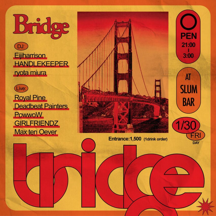 ★Bridge・開演:21時~03時・DJ:Eijiharrison.、HANDLEKEEPER、ryota.miura・LIVE:Royal Pine、Deadbeat Painters、Powwow、GIRLFRIENDZ、Max ten Oever・会場=SLUM BAR(沖縄市中央1-20-9 ガキヤビルB-1)