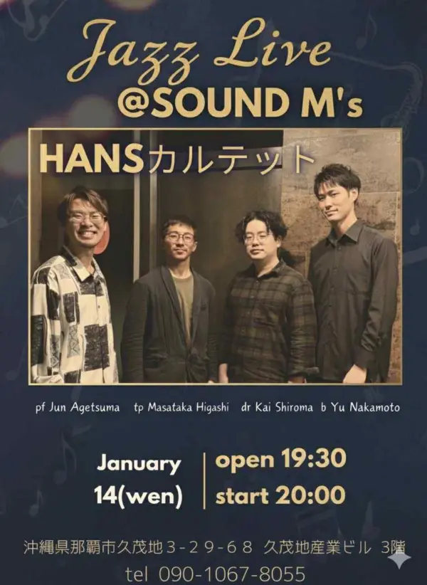 ★ジャズセッション・開場:19時30分/開演:20時・MEMBER=小禄真(tp)/佐久本ジョーイチ(gt)/東江敏文(bs)/ニコラス(dr)・会場=Live Music Bar SOUND M’S