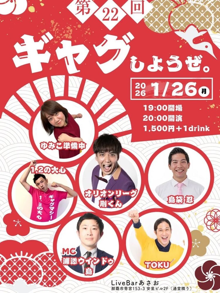 ★第22回ギャグしようぜ。・開場:19時30分/開演:20時・出演=オリオンリーグ剛くん、1.2の大心、浦添ウインドゥ島、ゆみこ準備中、TOKU、島袋忍・会場=LIVE BAR あさお