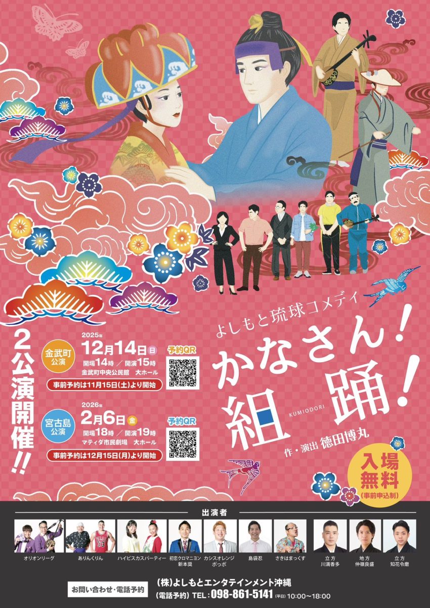 ★よしもと琉球コメディ「かなさん!組踊!」・開場:18時/開演:19時・出演=オリオンリーグ、ありんくりん、ハイビスカスパーティー、初恋クロマニヨン、新本奨、カシスオレンジ、ポっポ、島袋忍、さきはまっくす、川満香多、立方:仲嶺良盛、地方:仲嶺良盛、立方:知花令磨・会場=マティダ市民劇場 大ホール