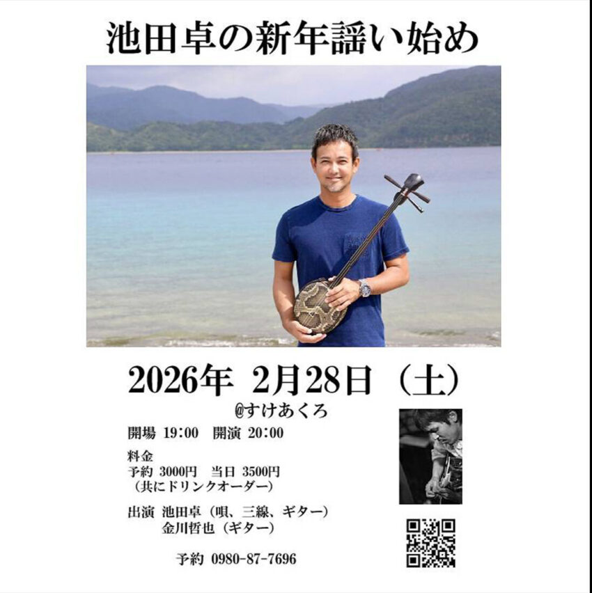 ★池田卓の新年謡い始め・開場:19時/開演:20時・出演:池田卓(唄、三線、ギター)、金川哲也(ギター)・会場=石垣市・JAZZ すけあくろ