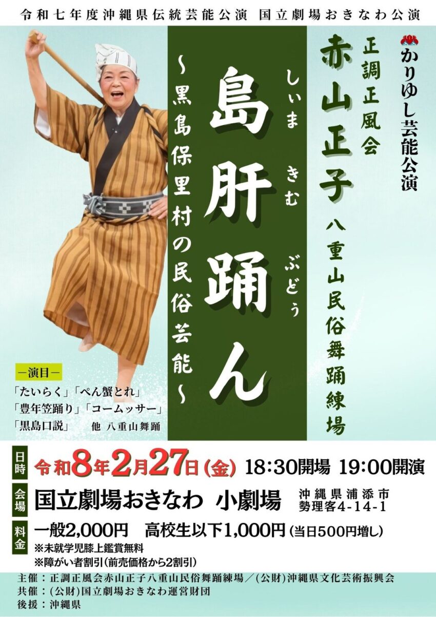 ★正調正風会赤山正子八重山民俗舞踊練場 「黒島保里村の民俗舞踊~島・肝・踊ん(しぃま・きぃむ・ぶどぅん)~」・開場:18時30分/開演:19時・会場=国立劇場おきなわ・小劇場
