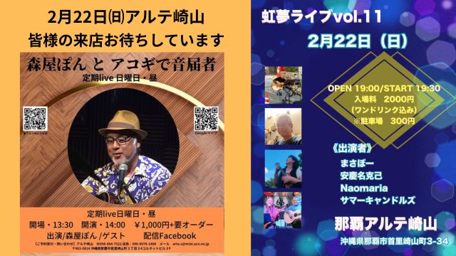 ★Music Lane Festival Okinawa 2026・Crossover Cafe 614 ・開場:13時45分/14時~14時30分:Strawman & Celine( Italy & Mongolia)・15時~15時30分:aimi・16時15分~16時45分:JŪJI (Thailand ) ・17時15分~17時45分:Sol・18時30分=19時:SIN x AOI YAMAZAKI( Thailand + Japan)・19時45分~20時15分:akira.drums・21時~21時30分:brkfstblend・会場=Crossover Cafe 614
