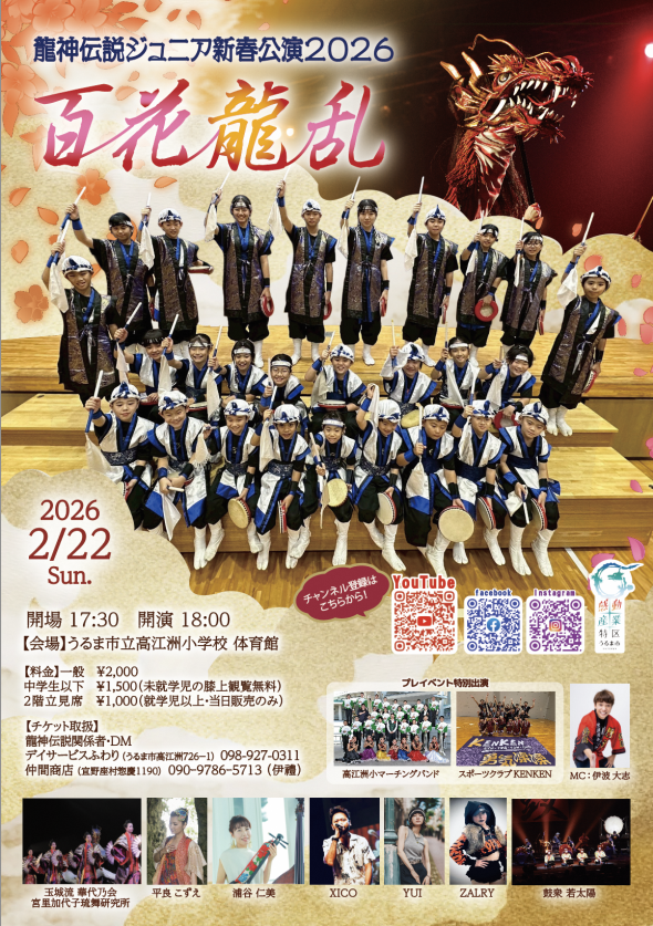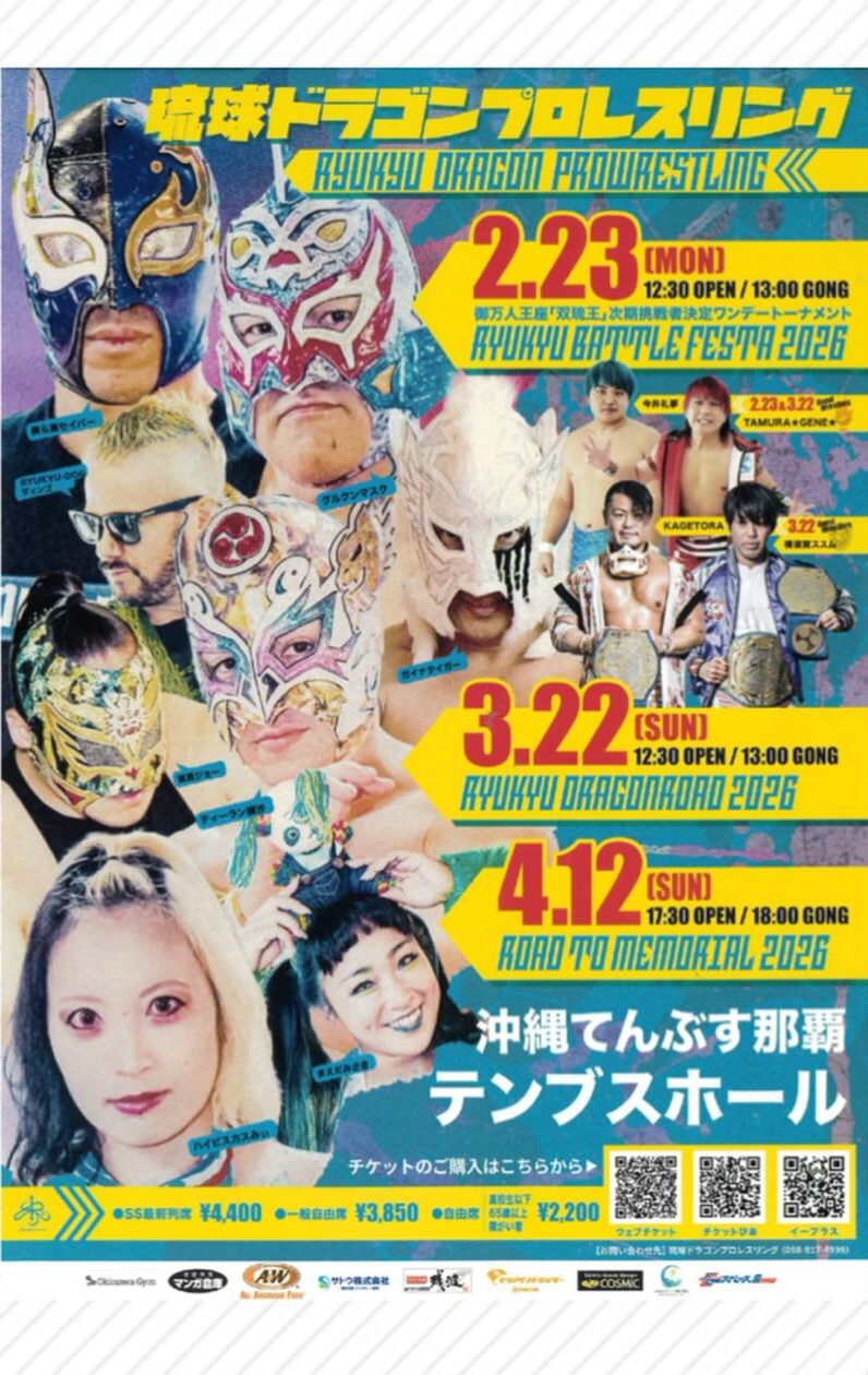 ★RYUKYU BATTLE FESTA2026 ~御万人王座「双琉王」次期挑戦者決定ワンデートーナメント~ ★・開場:12時30分/試合開始:13時・参戦選手=グルクンマスク、ハイビスカスみぃ、美ら海セイバー、ティーラン獅沙、まえだみさき、ガイナタイガー、首里ジョー、RYUKYU-DOGディンゴ、<ゲスト参戦選手>TAMURA GENE、今井礼夢・会場=てんぶす那覇・テンブスホール