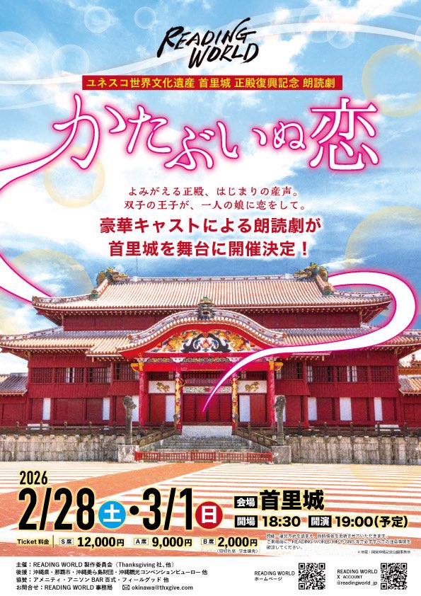 ★READING WORLD ユネスコ世界文化遺産首里城正殿復興記念 朗読劇 かたぶいぬ恋・開場:18時30分/開演:19時・会場=首里城