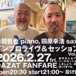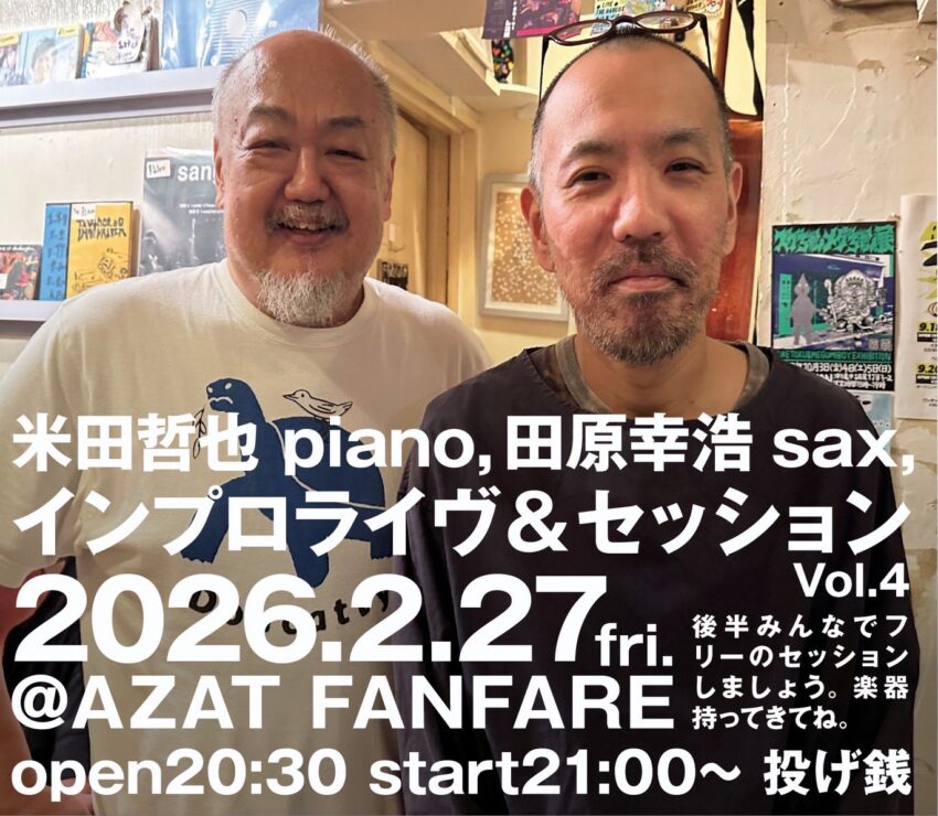 ★インプロライヴ&セッション Vol.4・開場:20時30分/開演:21時・出演=米田哲也 piano,田原幸浩sax・会場=AZAT FANFARE