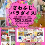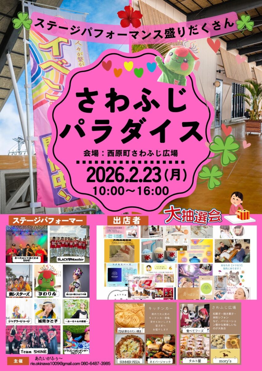 ★さわふじパラダイス・ステージパフォーマンス・11時18分~・主な出演者=城間さと子、TEAM SHINE、BLACK♥MONSTER、わったあじゃあぐぁBAND、東シスターズ・会場=さわふじ未来ホール(西原町小波津555)