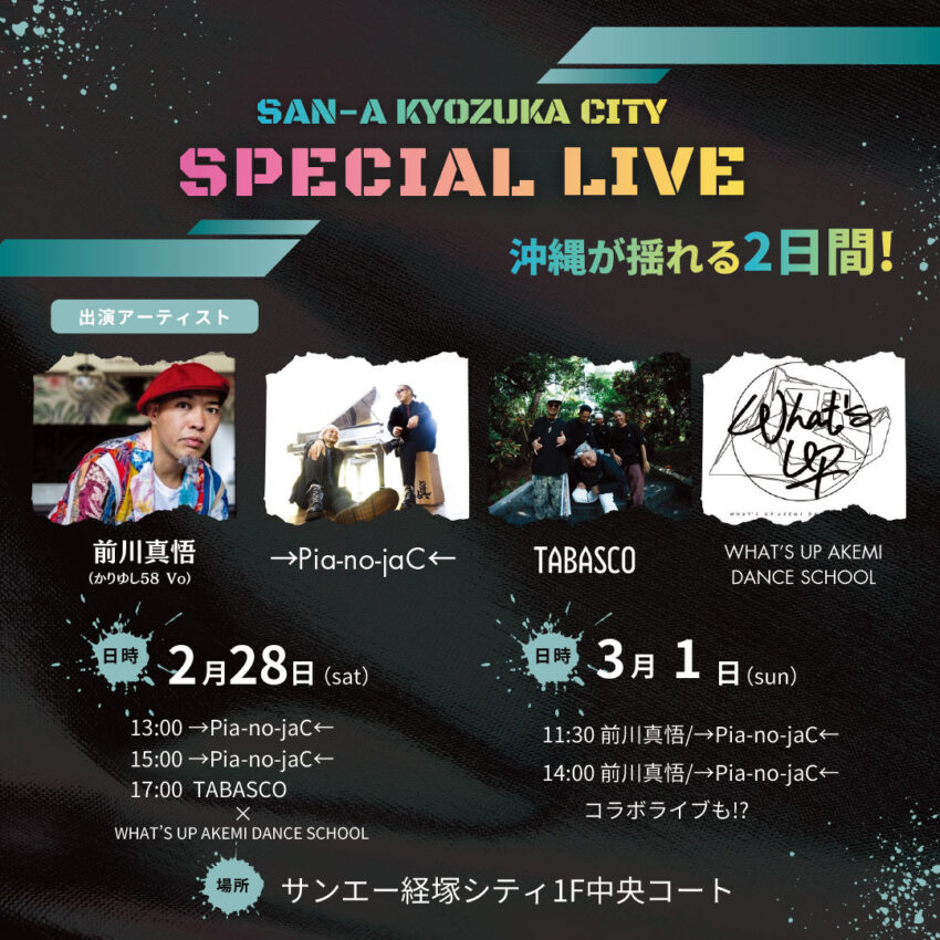 ★SAN-A KYOZUKA CUTY SPECIAL LIVE・13時~:Pia-no-jaC←・15時~:→Pia-no-jaC←・17時:TABASCO、X WHAT’S UP AKEMI DANCE SCHOOL・会場=サンエー経塚シティ1F中央コート