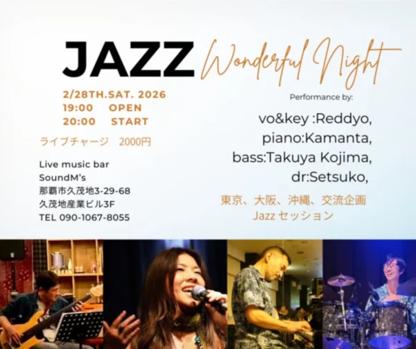 ★JAZZ Wonderful Night・開場:19時/開演:20時・MEMBER=Reddyo(vo.key)/カマンタ(pf)/小島拓也(bs)/まきのせつこ(dr)・会場=Live Music Bar SOUND M’S