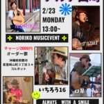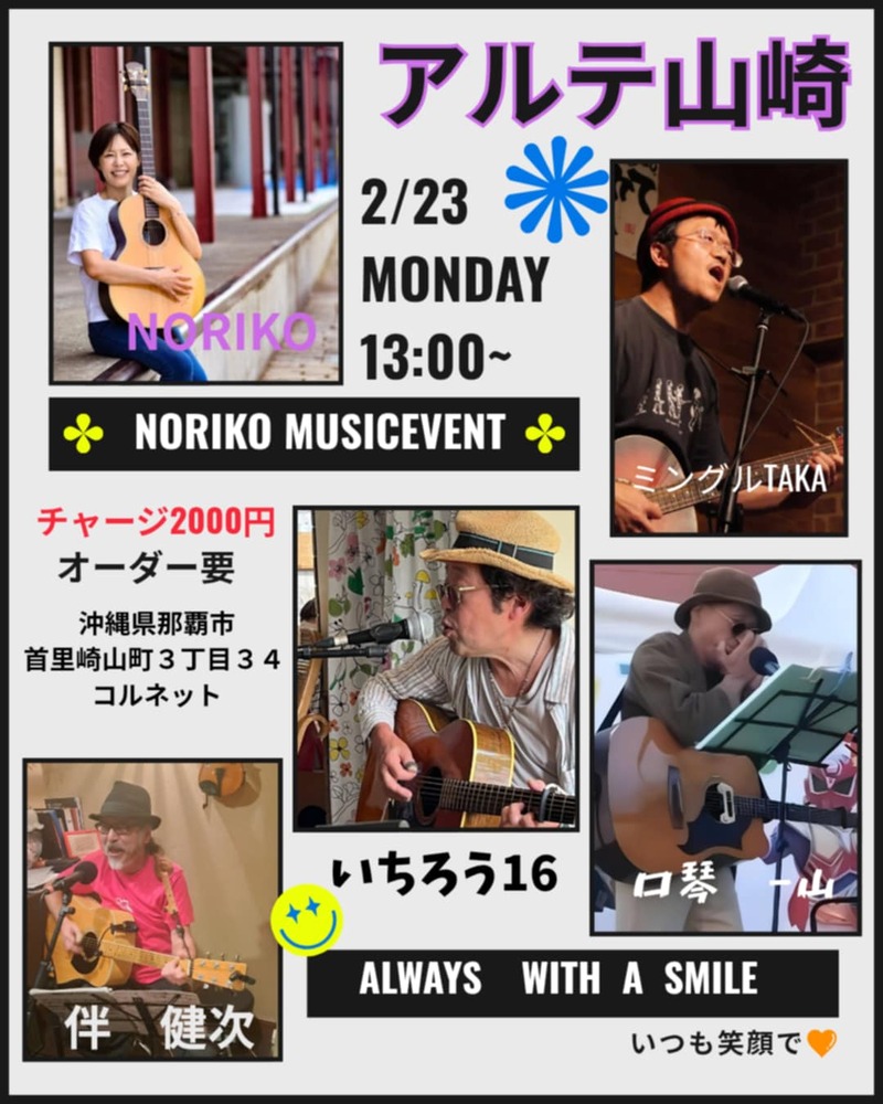★NORIKO MUSICEVENT ALWAYS WITH A SMILE・開演:13時・出演=NORIKO、ミングルTAKA、いちろう16、口琴 一山、伴 健次・会場=アルテ崎山