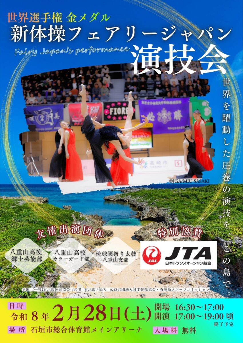 ★新体操日本代表フェアリージャパンの演技会・開場:16時30分/開演:17時~終演:19時・友情出演団体=琉球國祭り太鼓 八重山支部、八重山高等学校郷土芸能部、八重山高等学校カラーガード部・会場=石垣市総合体育館 メインアリーナ