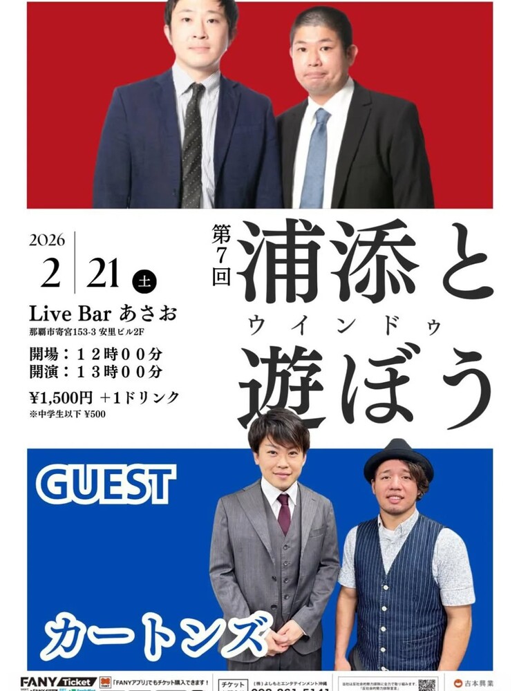 ★第23回ギャグしようぜ。・開場:19時/開演:20時・出演=オリオンリーグ剛くん、1.2の大心、浦添ウインドゥ島、ゆみこ準備中 TOKU またよしこうや・会場=LIVE BAR あさお