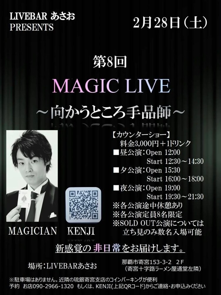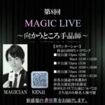 ★第8回マジックLIVE ~向かうところ手品師~・【昼公演】開場:12時/開演:12時30分・【夕公演】開場:15時30分/開演:16時・【夜公演】開場:19時/開演:19時30分・会場=LIVE BAR あさお