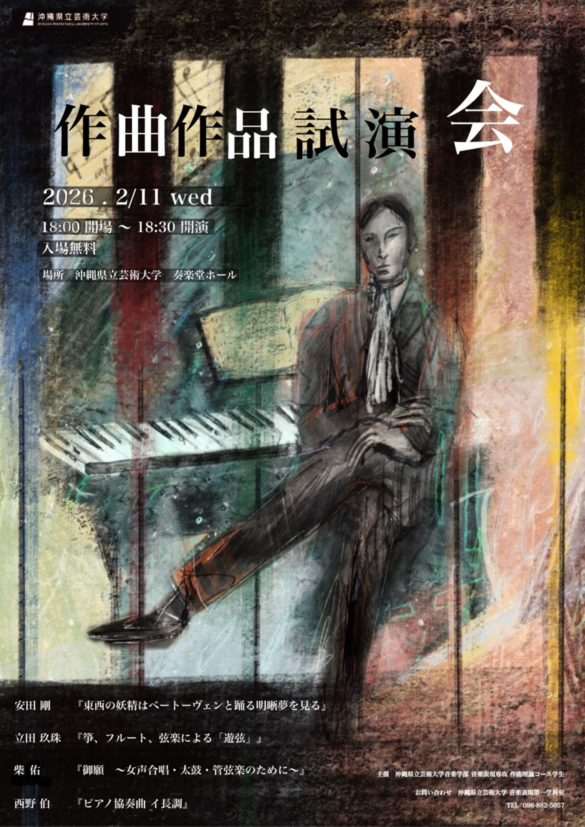 ★沖縄県立芸術大学・第 26 回 学 内 演 奏 会・開演:18時30分・出演=ピアノ(院)・内容=独奏・会場=沖縄県立芸術大学奏楽堂ホール(首里当蔵キャンパス)