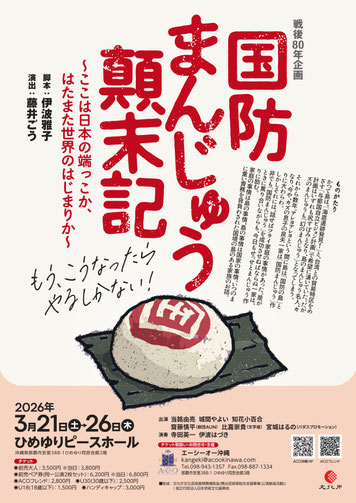 ★『国防まんじゅう顛末記』演劇公演・【昼公演】開場:13時30分/開演:14時・【夜公演】開場:18時30分/開演:19時・出演=当銘由亮、城間やよい、知花小百合、齋藤慎平(劇団AUN)、比嘉崇貴(文学座)、宮城はるの(バダスプロモーション)・演奏=寺田英一、伊波はづき・会場=ひめゆりピースホール