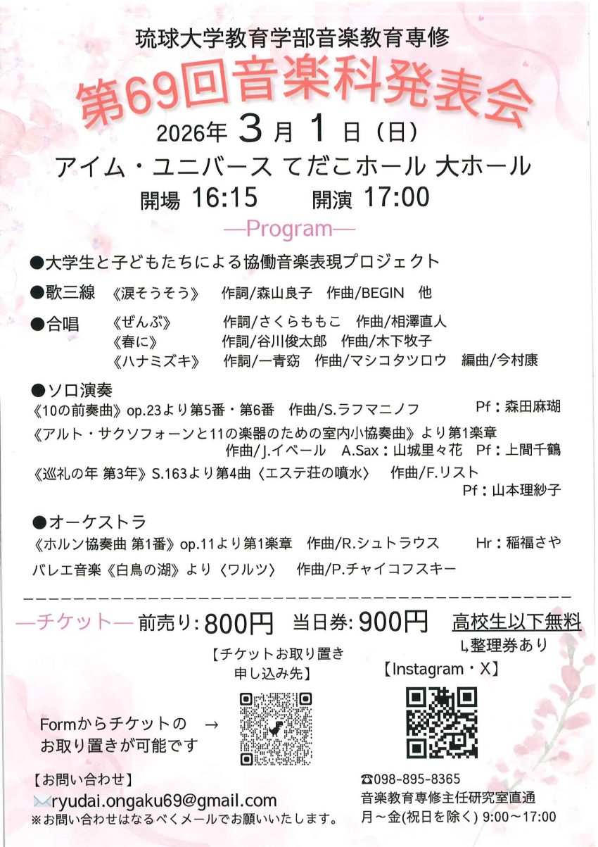 ★琉球大学教育学部音楽教育専修・第69回音楽科発表会・開場:16時15分/開演:17時・内容=大学生と子どもたちによる協働音楽表現プロジェクト・会場=アイム・ユニバースてだこホール・大ホール