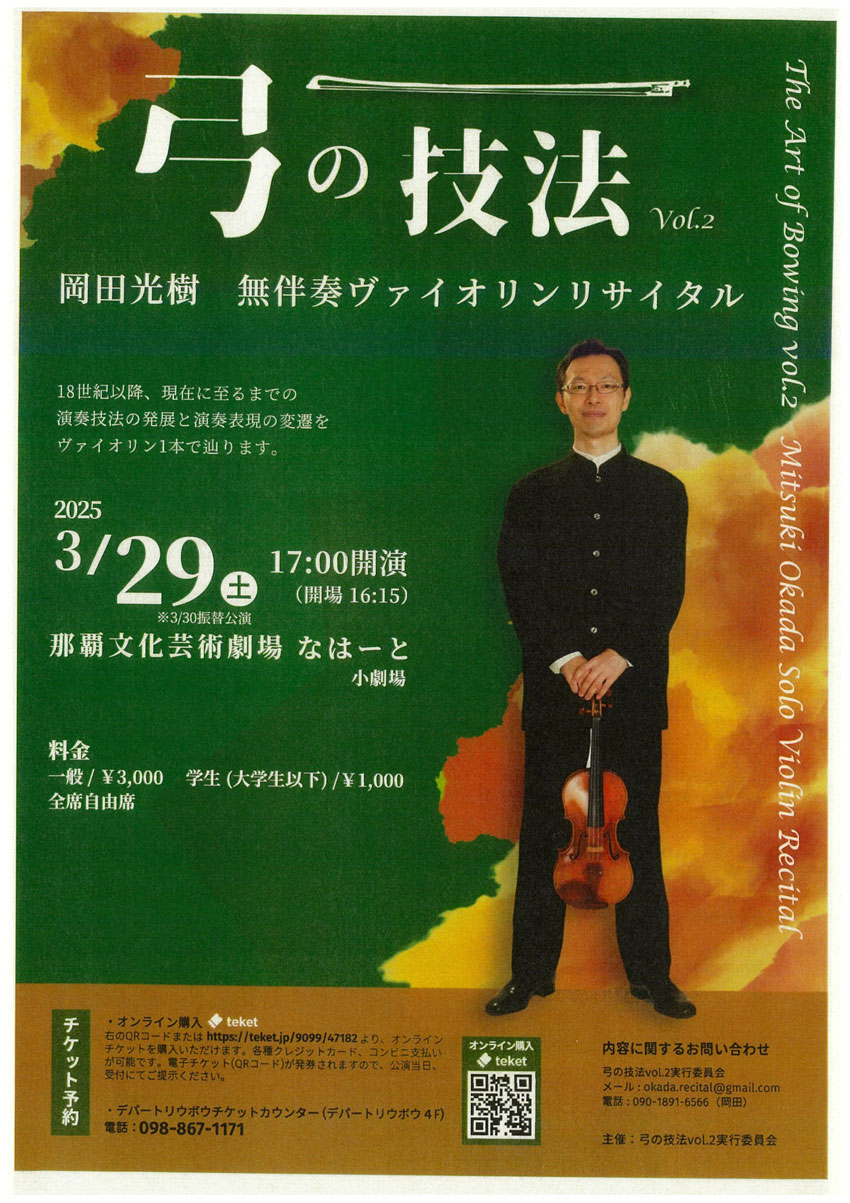 ★弓の技法vol.2 岡田光樹無伴奏ヴァイオリンリサイタル・開場:16時15分/開演:17時・出演=岡田光樹・会場=那覇文化芸術劇場なはーと
