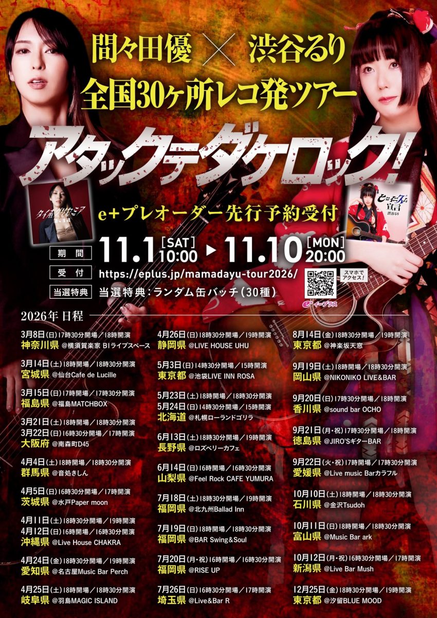 間々田優×渋谷るりレコ発ツアー アタックテダケロック! ・開場:18時30分/開演:19時・出演=間々田優/渋谷るり・会場=Live House CHAKRA(那覇市牧志1-2-1 花ビル5F)
