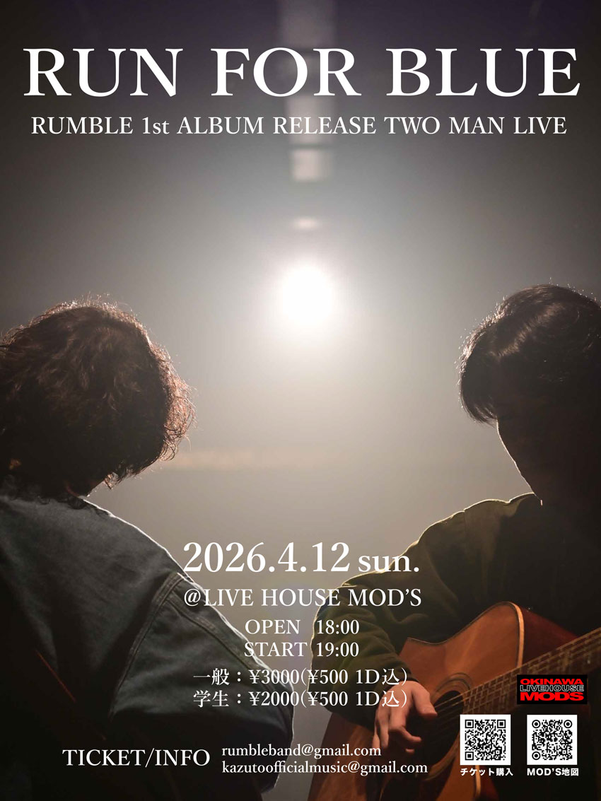 RUN FOR BLUE RUMBLE 1st ALBUM RELEASE TWO MAN LIVE・開場:18時/開演:19時・会場=LIVE HOUSE MOD’S